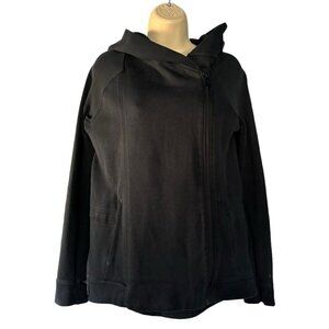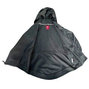 Nike Asymmetric Zip Tech Fleece Oversize Hoodie. Hoodie is solid black and fleece-lined with long sleeves, thumb holes, drawstring waist and an asymmetrical zipper down the front. It's made of a cotton poly blend and is a woman's oversize XS.
