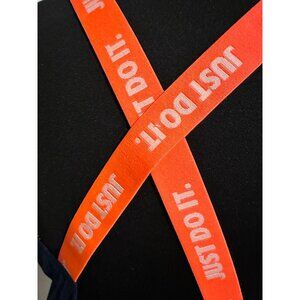 Colorway: Deep navy body with bold orange “Just Do It.” cross-back elastic straps