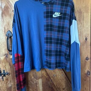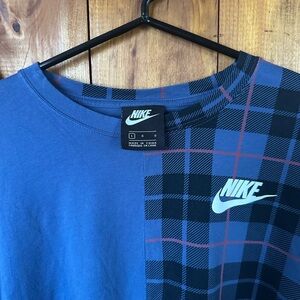 Stylish Nike sweatshirt with blue and red plaid accents. Comfortable and trendy design. Cropped, in excellent condition