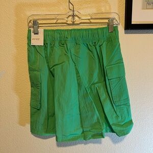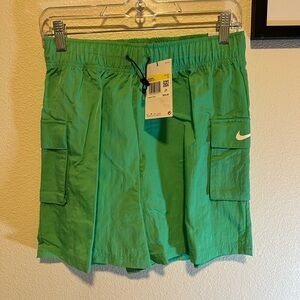 Nike athletic shorts in vibrant green. Features cargo pockets and elastic waistband. Ideal for sports and casual wear.