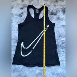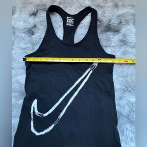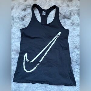Racerback Experience the perfect blend of style and performance with this Nike black tank top, featuring a fitted design and a bold white swoosh logo. Crafted from high-quality athletic material, it offers a comfortable and breathable fit for any workout. The scoop neckline adds a touch of elegance, making it a versatile addition to your activewear collection.