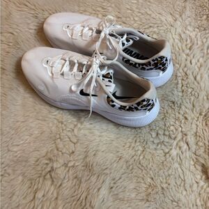 Stylish Nike athletic shoes for women. Features a sleek white design with leopard print accents. Perfect for sports and casual wear.