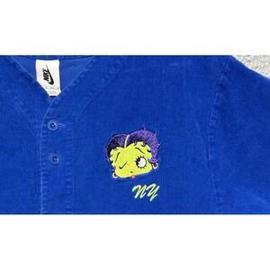 The Nike X Olivia Kim Betty Boop Corduroy Baseball Jersey in Blue is a stylish and comfortable women's XS casual top featuring a V-neck, short sleeves, and button closure. Made from corduroy fabric, this relaxed fit jersey is adorned with Olivia and Betty Boop character details, making it a fun and unique addition to your activewear collection. Easy to care for with machine washable instructions, this limited edition Nike collaboration is suitable for travel, outdoor activities, and daily wear, adding a colorful and playful touch to your wardrobe.