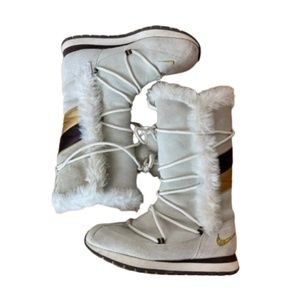 Nike Y2K 2000’s winter snow ski boots, mid calf leather suede boots, waterproof boots, Nike Winter High off white / taupe suede faux fur trim pom pom snow boots, Y2K vibes Mid Calf Winter Ski Boots, Nike winter boots, Nike snow boots, Nike mid calf boots, Nike athletic boots, Winter athletic boots, warm insulated winter boots