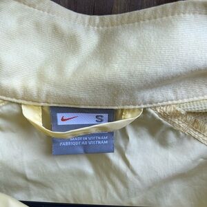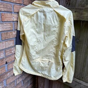 Lightweight yellow utility jacket. Features zip closure and black accents. Perfect for casual wear.