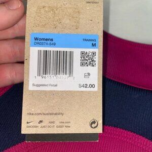 Nike Yoga NWT women's Dri-Fit fuchsia/navy athletic tank top. Round neckline. Wide straps. Slim fit. Open back. Rounded hemline. Moisture wicking. Quick drying. Size Medium. Length 25", Chest 16" lying flat. 80% Polyester, 20% Spandex. Machine wash cold.