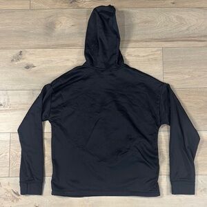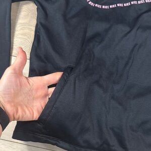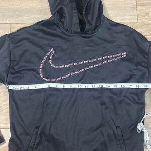 Nike Therma Fit Graphic Girls Hoodie Soft inner lining Hoodie is Black and Pink Pink embroidered swoosh on left wrist Thumb holes Dri-Fit Loose Fit size Youth XL 14/16 Like new condition- no flaws Initials were written on neck tag- see photos The hoodie features a large Nike swoosh logo across the chest, filled with repeating "NIKE" text in pink. A smaller pink Nike swoosh is visible on the left sleeve cuff. The hoodie also has a front pouch pocket and a hood. Nike Therma-FIT technology helps manage body heat to keep the wearer warm in cold conditions. Pullover, hood, athletic, activewear