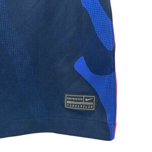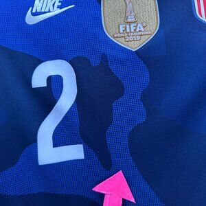 USWNT - United States Womens National Team - Short sleeve soccer jersey / football jersey - shades of navy blue & blue with hint of red. Mallory Pugh No 2 - FIFA 2019 World Champions patch on the front. 100% Recycled Polyester.