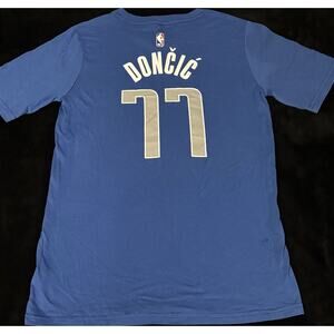 The Nike Dallas Mavericks Luka Doncic T-Shirt in blue is a new with tags shirt that is officially licensed by the National Basketball Association (NBA). This shirt features the player Luka Doncic from the Dallas Mavericks, making it a perfect item for basketball fans. The shirt is comes in a YM (10-12) size, allowing fans to show their support for their favorite team and player in style. New with tags.