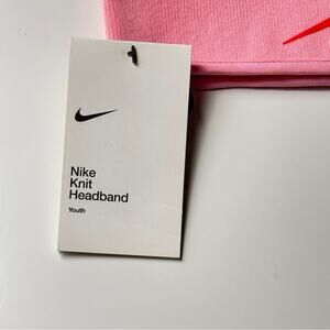 Stylish pink knit headband with red Nike logo.