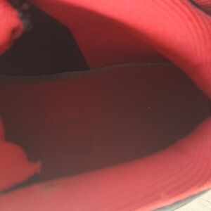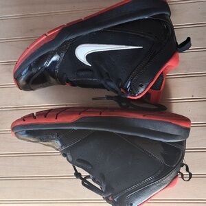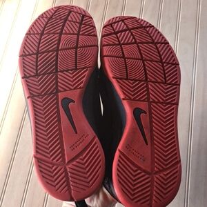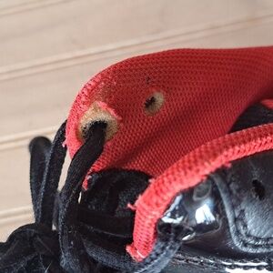 A nice red and black color with a white nike sign on the side. Dark shoes so will hide many imperfections. Patent front. Great for sports, streetwear, gym, play, activewear, sportsmanship, great everyday shoe- tennis shoes.