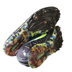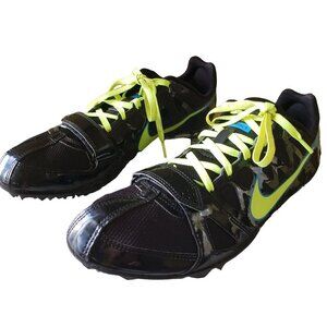 Black, blue, and neon yellow track and field spike sneakers. Velcor strap in the front of sneaker and neon yellow shoe strings. Excellent condition.