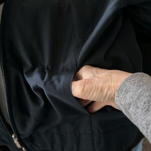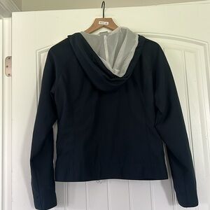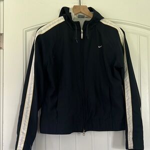Sleek navy jacket featuring white accents. Includes a hood and zip closure. Ideal for everyday wear.
