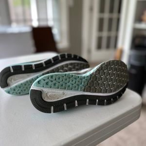 Very good used condition Nike running shoes. Fun olive color with white and blue accents.