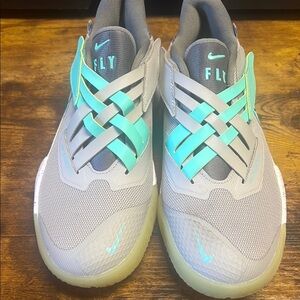 Stylish Nike sneakers with a modern design. Features a gray mesh upper with teal accents. Comfortable and trendy for everyday wear.