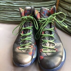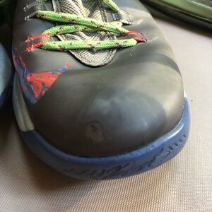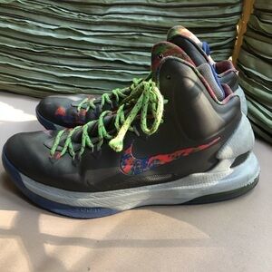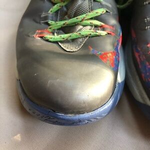 enhance the NBA phenom's unique set of skills and plays off the significance of the number "5" for basketball and Durant, including 5 players on a team, 5 sides to the Pentagon building in Washington D.C. and 5 corners of a star. "KD" logo on the tongue, The "Splatter" edition also sports a vibrant splatter-like print on the Swoosh, lining, and "KD" logo, plus matching neon laces.
