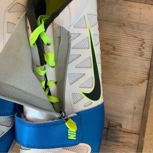 White and blue with neon yellow trim, Velcro closure, flap zips over laces, great condition!