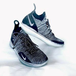 Nike Zoom KD 11 Xl Basketball Flyknit shoes AO2604-004 Kevin Durant mens size 8.5 RARE. Zoom Air. Cushioning insole system with NIKE impact Midsole foam. Color: Black and grey Twilight Pulse. Grey and black Flyknit upper, sock-like ankle collar, and signature heel branding.