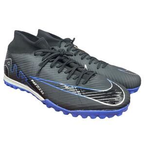 The Nike Zoom Mercurial Superfly 9 Academy TF Soccer Shoes in Men's Size 12 are black cleats specifically designed for the sport of soccer. Made by Nike, these shoes are part of the superfly 9 academy tf line, offering a medium width for a comfortable fit on the field. Crafted in Indonesia, these shoes provide players with the speed and agility needed to excel in their game. Perfect for both amateur and professional soccer athletes, these Nike cleats are a reliable option for achieving peak performance on the pitch.