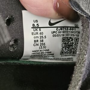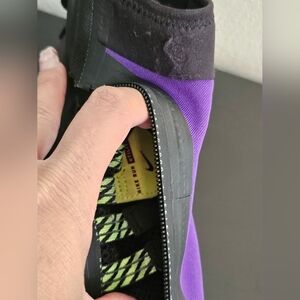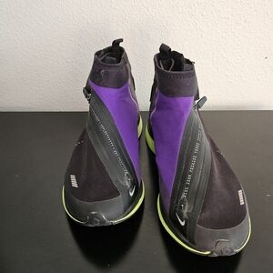 Nike high-top sneakers in black and purple with a green sole. Features a sleek design and Nike logo.