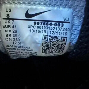 The shoes are in poor condition with major flaws. The white swoosh on the right shoe has a hole in it. The shoes are also have some wear and tear. The spikes are missing on the bottom of one of the shoes as well.