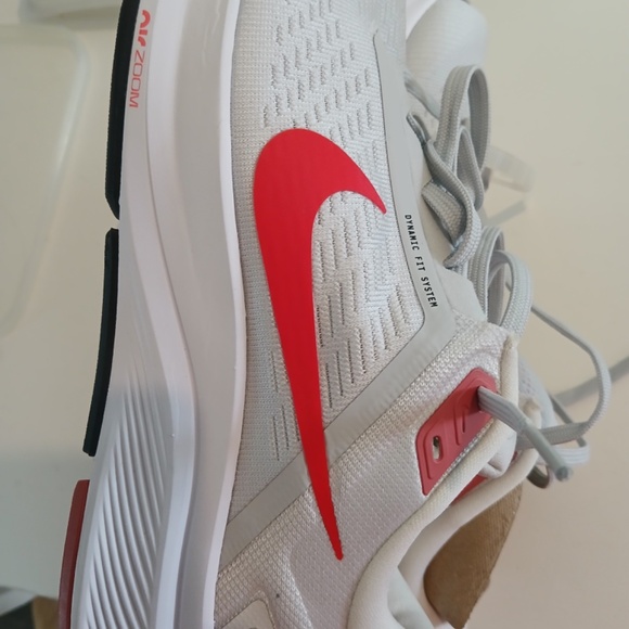 Shoes are new and haven't been used. White shoes with red nike checkmark. Men's shoes size 9.5.