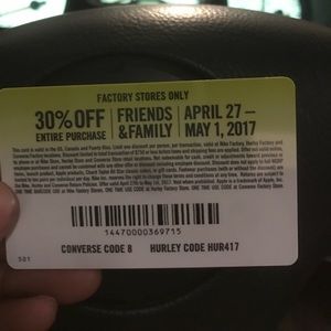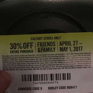 Friends and family pass. This pass is good for one use for 30% off a entire purchase at a nike, converse and Hurley outlet store. Pass can also be used once at a INLINE nike store I.e ( the grove , Santa Monica) for 40% off entire purchase .. pass is good for 750 dollars of merchandise after the discount . Have about 25 passes so act fast.