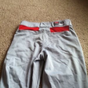 Red logo. Grey pants. Red mesh pockets. Red piping. Looks wrinkled, not wrinkled when worn. Performance/ sporting feel.
