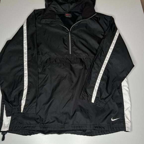 Vintage-style Nike pullover windbreaker jacket in men’s size XL. Black with white side stripe accents and embroidered swoosh on hem. Features half-zip front, hood, front zippered kangaroo pocket, and adjustable drawcord hem. Pre-owned in good condition, minimal signs of wear.