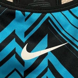 Nike blue and black print sports bra, size large. In good used condition. There’s light cracking on the logo. This is a Nike pro sports bra. Are you doing the measurement around the bands laying flat is 14 inches. There is no padding. I am open to offers. Bundle and save!