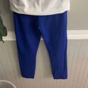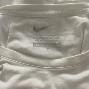 White short sleeve T-shirt with Nike logo along with matching blue Nike joggers