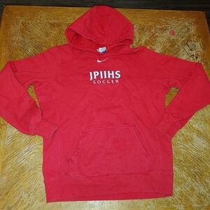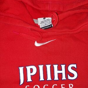 Nike center swoosh pullover hoodie size large embroidered in fair condition has 2 holes at pocket shown in pictures has "JPIIHS SOCCER" embroidered at chest see pictures for reference