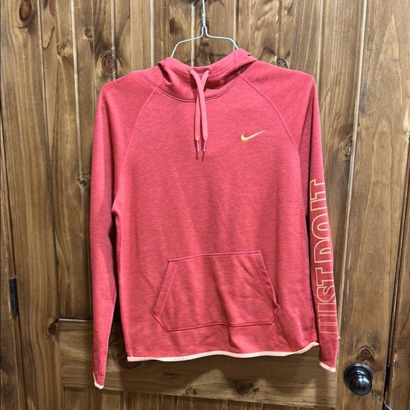 Stylish red hoodie featuring a Nike logo. Comfortable and trendy design.