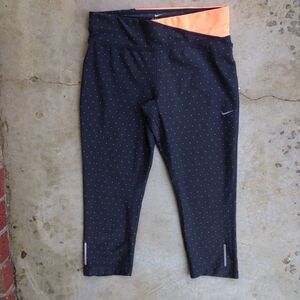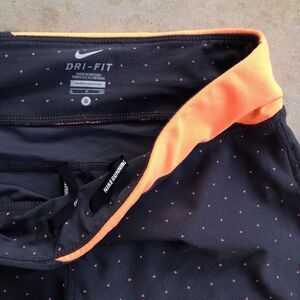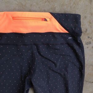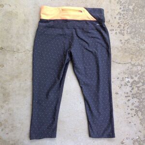 Cropped Gray with neon orange trim at the waist, and small orange triangles all over. Back zipper pocket. Reflective detailing near the leg opening. Drawstring waist. Polyester with 8% spandex. Excellent condition!