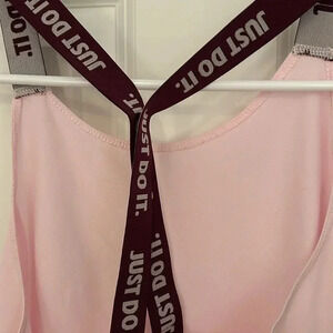 This is a Nike dry fit pink tank top. The straps are elastic and are in burgundy and say just do it. It’s an extra large. Wash with like colors. hundred percent polyester.