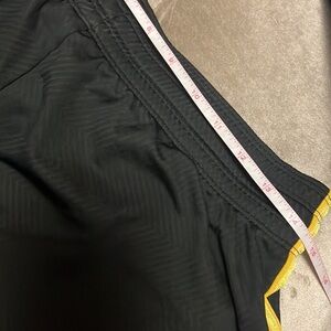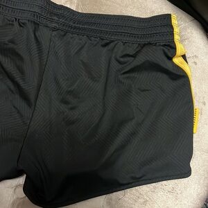 Gently used Nike dry fit shorts with the livestrong logo, in black and gold. These have a white tie at the waist band so you can make them fit you perfectly and the inseam is just over 3 inches and they are about 11 inches long. These have a nice Textured look to them although they’re smooth and very comfortable. Very good used condition.
