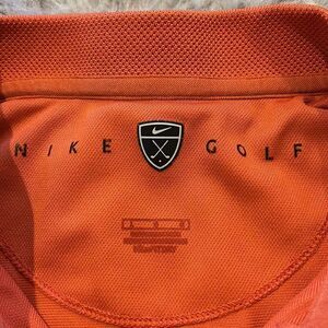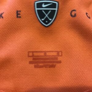 Nike golf men’s orange logo polyester short sleeve polo size large, small stains on front of shirt as shown in picture, hemming is coming undone in small areas on front and back of shirt as shown in pictures