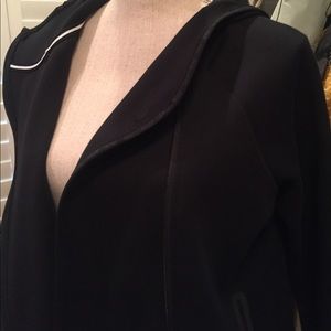 Black zip workout jacket with hood and lower back end. New size small. Retail 130 I bought on sale but too small. Back length 28" front 21" sleeve 24.5" and bust 20". Cotton poly blend for easy care.