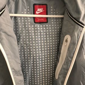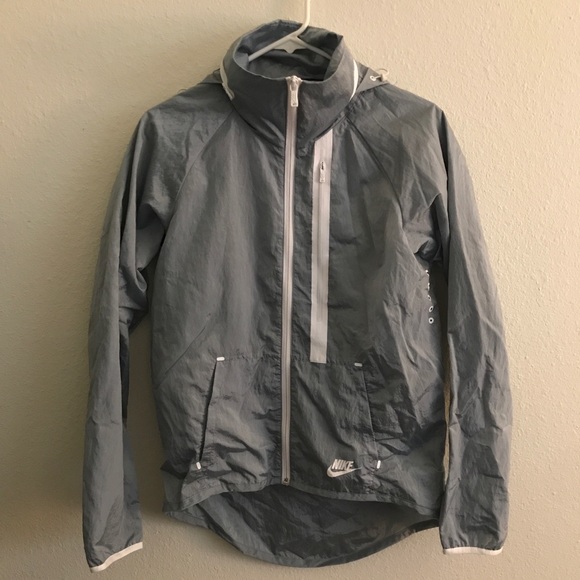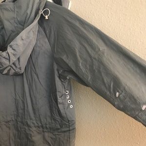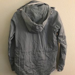 Light windbreaker perfect for running, hiking, etc and cute enough to wear anytime. Beautiful gray/blue color. Hood can be zipped and stowed on jacket. Lots of pockets.