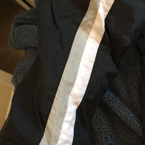 This jacket is next to new. I truly don’t think it has even been worn. Wrinkly from behind packed but easily Aired out. Stripe detail down arms. 0 wear or tear