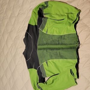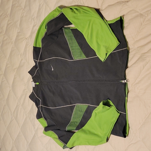 Nike fitted jacket, good for morning runs, though I refuse to get up so I wouldn't know. sleeve pocket for ID, double zipper (can unzip top down or bottom up)