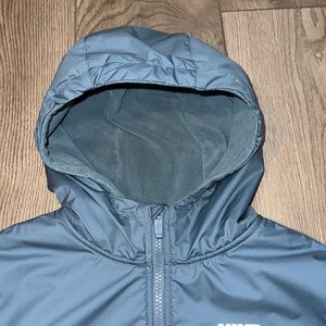 Kids size large. It’s a girls jacket but has a unisex fit and is blue so it can definitely be for a boy. Fleece, and windbreaker material. 2 pockets, hood, working zipper.