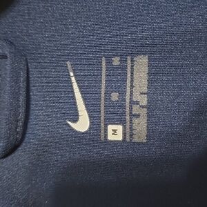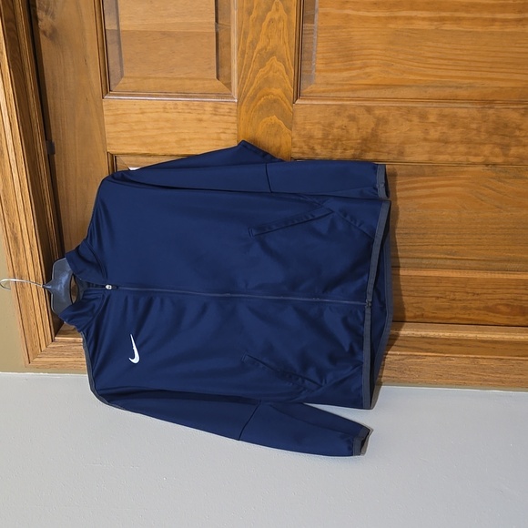 EUC unisex navy with dark gray stripes going down sleeves to elbow zip up jacket with 2 front zip close pockets.
