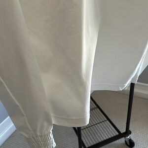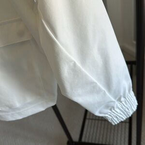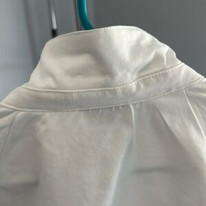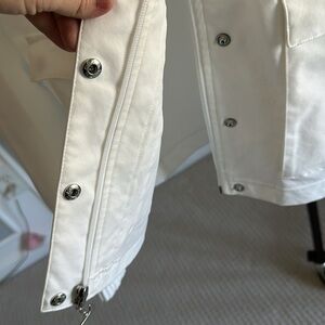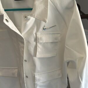 Super cute Nike jacket white with sliver swoosh. Pockets- buttons- and zips. Bought brand new never worn but someone in store must of tried on and makeup got on the inside part of the collar. I have not laundered or tried getting out but you cannot see when wearing only on inside. See last 2 pics for details.