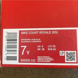 Nike Court Royale (GS) in white, pink, and laser blue. Stylish and comfortable.