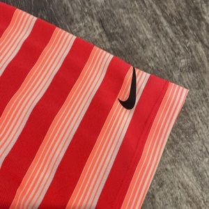 Mens size medium Nike classic fit golf shirt. This shirt is red with pink and white black pattern stripes. This is a tour shirt with an extra swoosh down into the left chest. Only issue is the size tag is washed out of the collar, but I can assure this is a medium…can send measurements if requested. In great condition from a smoke free pet free home.