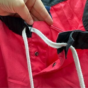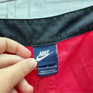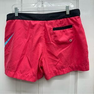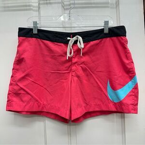 Nike swim shorts in vibrant red with a blue swoosh. Features a drawstring waist and back pocket.