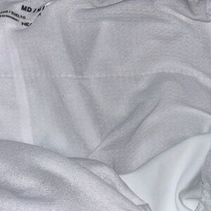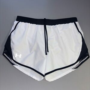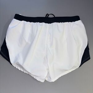 Under armor gym shorts run heatgear loose lined white black medium - good preowned condition- a couple minor imperfections, snag on the liner and a tiny pull on the fabric. SEE PHOTOS 5 & 6 for reference.