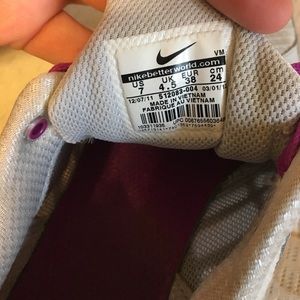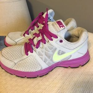 Gently worn Nike relentless 2 shoes. Grey base with lime green swoosh and purple laces