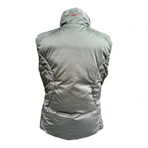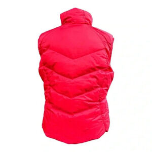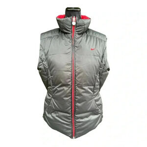 Nike women’s overstuffed down reveraible vest in red and black colors with pockets on each side.